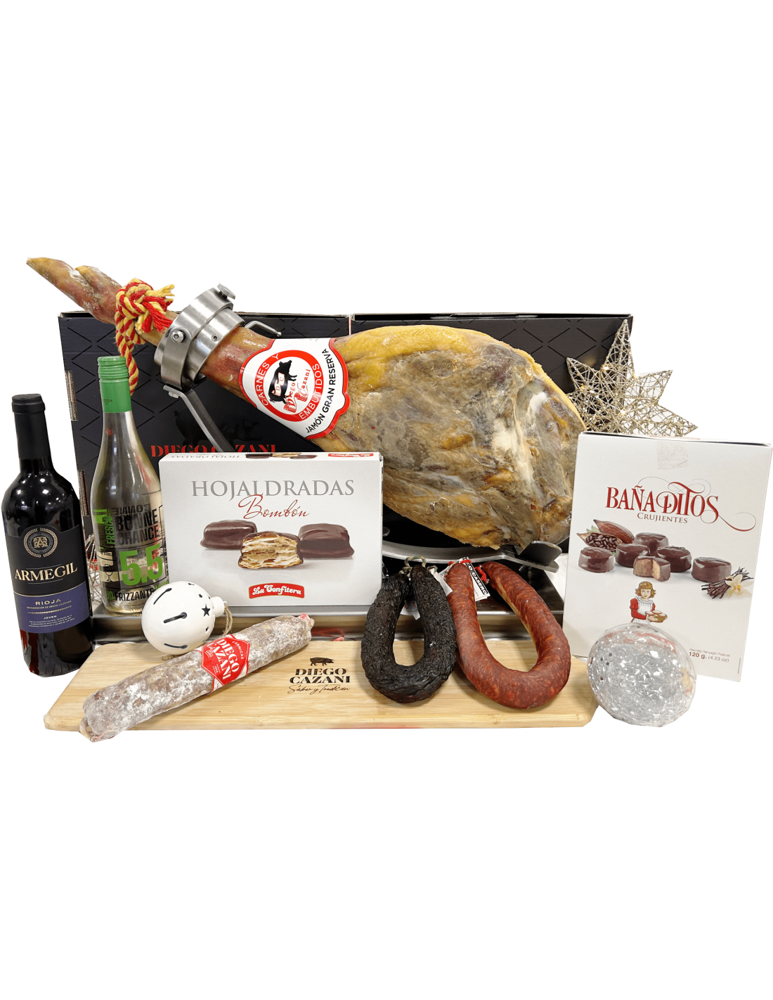 CAJA DECORADA 1 BOTELLA ACEITE DE OLIVA VIRGEN EXTRA 250ML COOP LA SALUD 1 SOBRE DE SALCHICHON IBERICO CULAR DE 100GR DIEGO CAZANI 1 SOBRE DE CHORIZO IBERICO CULAR EXTRA 100GR DIEGO CAZANI 1 SOBRE DE CAÑA DE LOMO IBERICA CEBO 50% DE 100 GR DIEGO CAZANI 1 SOBRE DE JAMON IBERICO DE CEBO 50% DE 100 GR DIEGO CAZANI 1 BOTELLA DE VINO DE ARMENGIL...