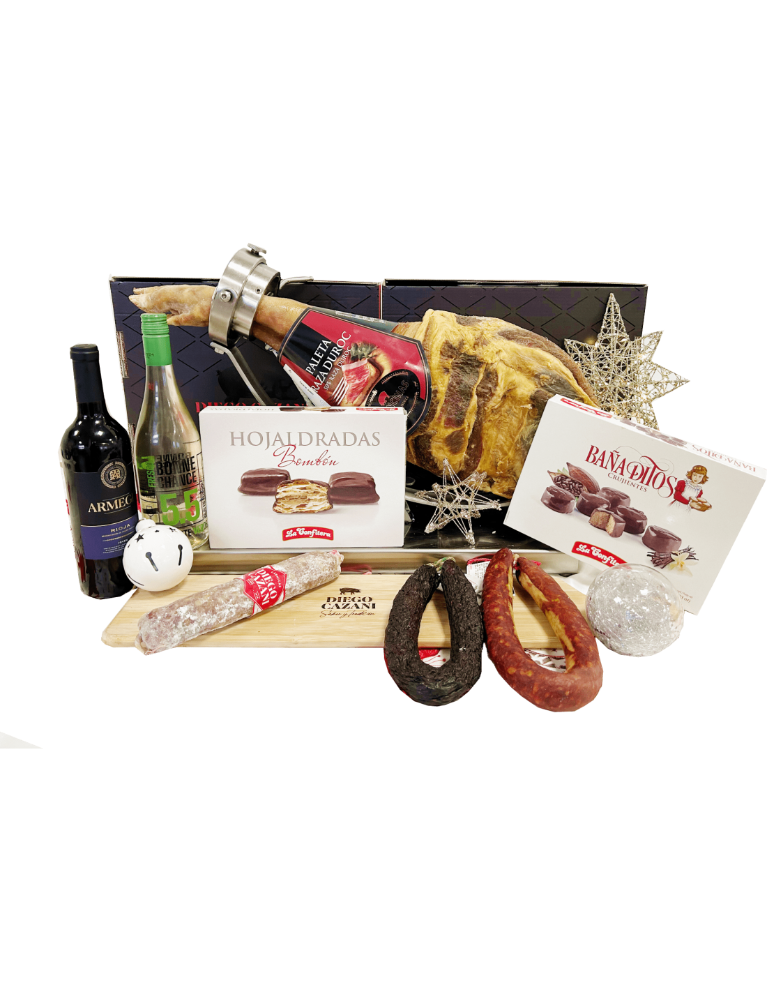 CAJA DECORADA 1 JAMON GRAN RESERVA DIEGO CAZANI 7,5KG 1 SALCHICHON CASERO DIEGO CAZANI DE 350GR 1 CHORIZO CASERO DIEGO CAZANI DE 450GR 1 MORCILLA DE CEBOLLA DIEGO CAZANI DE 400GR 1 CAJA DE BAÑADITO CRUJIENTE 120GR 1 CAJA DE HOJALDRADA BOMBON 180GR 1 BOTELLA DE VINO DE ARMENGIL JOVEN DO RIOJA 750ML 1 BOTELLA DE VINO BONNE CHANCE 5.5...